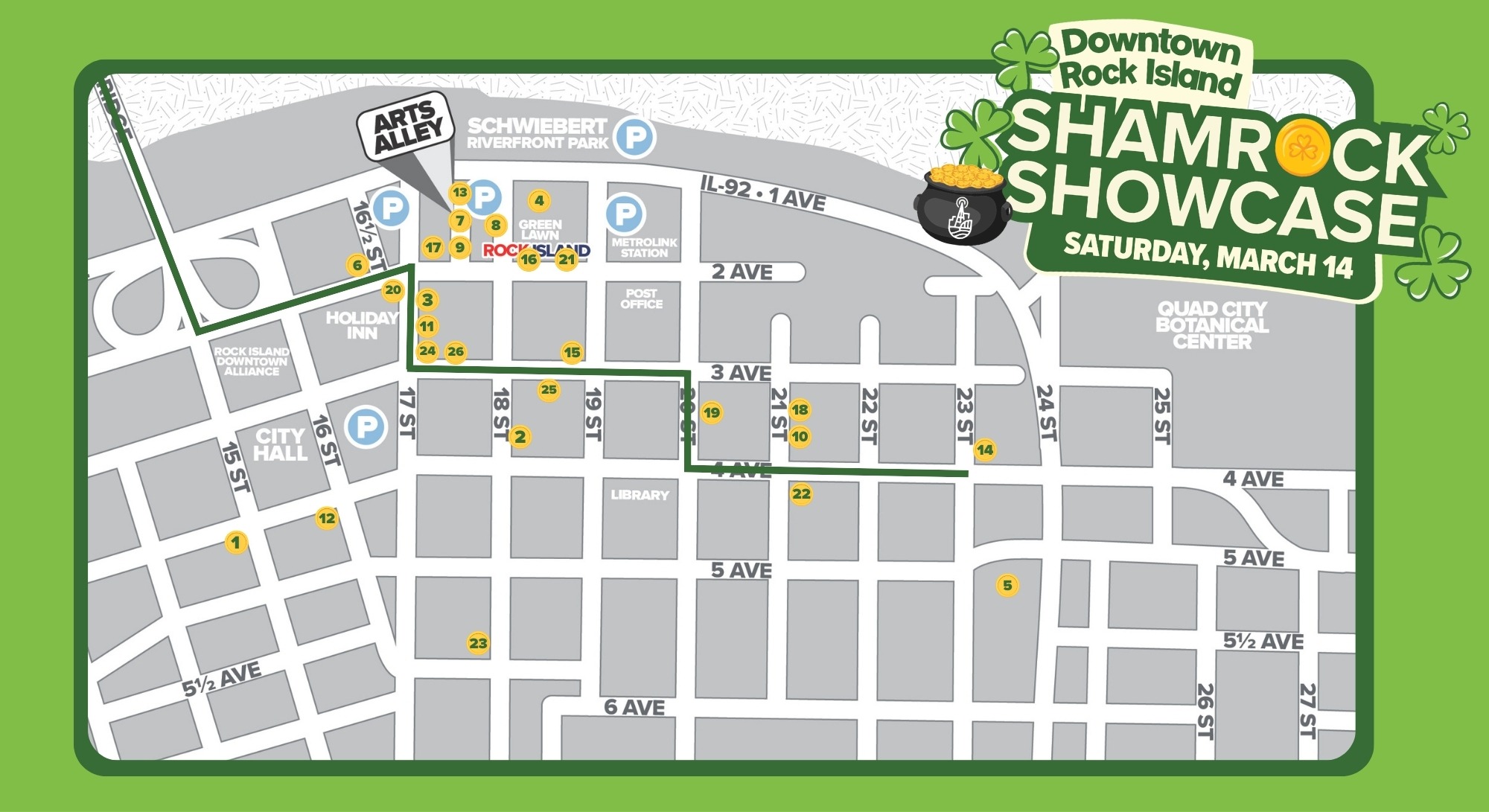 Just off the Grand Parade route, Arts Alley, 1719 2nd Ave., will come to life during the Shamrock Showcase beginning at 9 a.m. Saturday, March 14. Activities include free face painting, leprechaun interactions and photo ops, Flaherty's Irish Candy Co.'s pop-up shop and La Flama Mexican Restaurant's food truck.